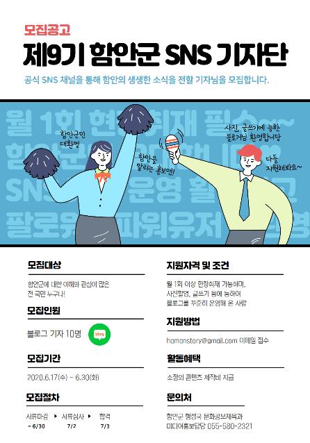 함안군은 공식 SNS 채널을 통해 군민과 소통하고 함안의 생생한 소식을 전할 ‘제9기 함안군 SNS 기자단’을 오는 30일까지 모집한다고 18일 밝혔다.
