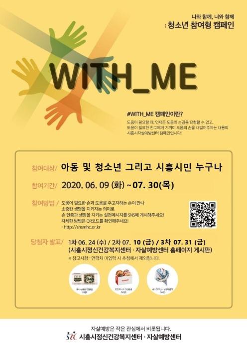 시흥시(시장 임병택)는 코로나19로 인해 기존보다 늦은 5월 중순부터 등교를 시작한 아동·청소년들의 마음건강을 돌보기 위해 ‘#WITH_ME' 캠페인을 진행한다. 캠페인은 아동?청소년과 시흥시민 누구나 참여가능하며 6월 9일부터 7월 30일까지 개인 SNS와 시흥시정신건강복지센터?자살예방센터 홈페이지에서 진행된다.