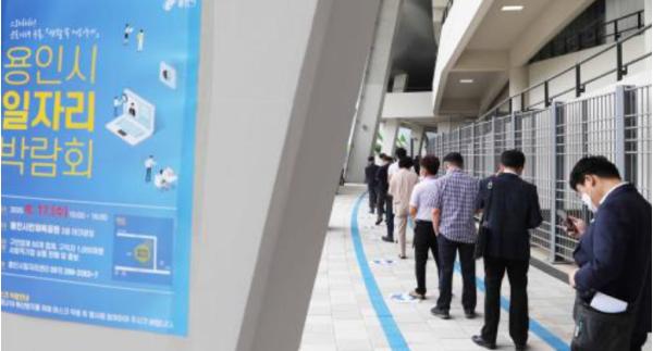이날 행사장엔 코로나19 여파로 취업문이 좁아진 가운데 일자리를 잡으려는 시민들이 아침 일찍부터 몰렸다. 거리두기를 위해 미처 입장하지 못한 100여명의 시민들은 행사장 주위로 길게 줄을 이었다.