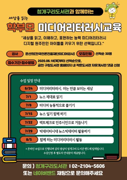 교육은 청개구리 작은도서관 밴드를 통해 6월 24일 ~ 8월 5일 매주 수요일 7차시에 걸쳐서 진행된다.