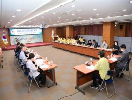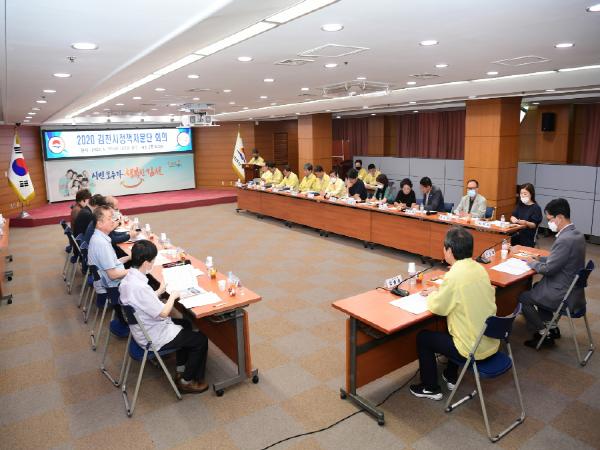 김천시(시장 김충섭) 민선7기 정책자문단(위원장 홍진영) 회의가 6월 19일(금) 14시부터 시청 2층 회의실에서 김천시장, 정책자문단 위원 및 해당 실과장?팀장이 참석한 가운데 2020년도 상반기 정기회의를 개최했다.