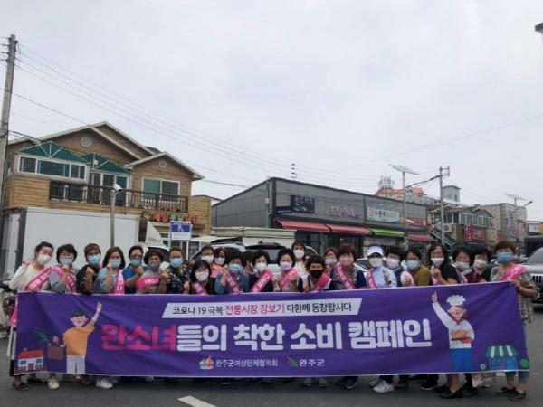 이날 여성단체회원 50여명은 완주군에서 지원 받은 2차 긴급재난지원금을 지역사회에 빠르게 소비해 경제효과에 기여하고자 ‘완(완주의) 소(소중한)녀(여성)들의 착한 소비 캠페인’(2회차)을 실시했다.