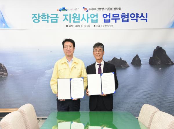 부산 남구(구청장 박재범)는 19일 (재)부산중앙고 영(嶺)장학회(이사장 이재우)와 저소득층 학생을 위한 장학금 지원사업 업무협약을 맺었다.