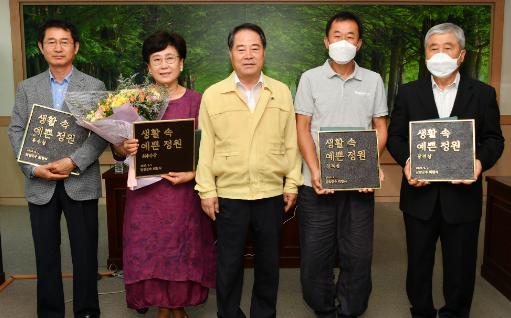 응모된 정원은 1차 서류심사와 2차 현장 심사를 거쳐 최우수상 1개소, 우수상 1개소, 장려상 3개소 등 총 5개소가 선정됐으며 선정된 정원은 상장과 부상으로 예쁜 정원을 인증하는 현판이 주어진다.