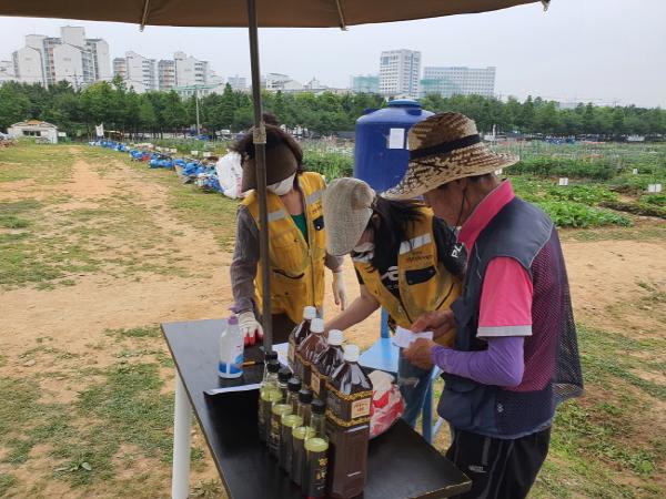 안산시 녹지과 산림자원화사업단에서 수거한 은행나무 열매 400㎏로 만든 친환경 천연살충제는 1.5리터 병 150개 양으로, 지난 18~19일 단원구 초지동 주말농장과 이날 상록구 한대앞역 인근 농장에서 지급됐다.