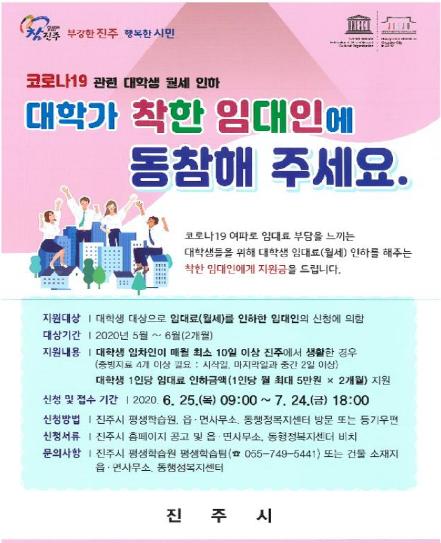 지원신청 기간은 오는 6월 25일부터 7월 24일까지 1개월간이며, 임대인(건물주)은 대학생 임차인으로부터 매월 10일 이상 진주에서의 생활증명서류, 재학증명서, 임대료 인하확인서 등 증빙서류를 받아 진주시 평생학습원 또는 건물소재지 읍·면사무소나 동행정복지센터에서 신청할 수 있다.