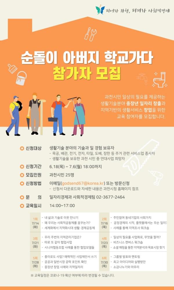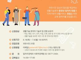 시에서 주최하는 이번 교육은 목공, 배관, 전기, 타일, 청소, 도배, 장판 등 주거 관련 종사자 또는 기술을 보유한 과천시민을 대상으로 하며, 연대와 협동이라는 사회적경제 방식의 창업을 위한 길잡이 교육이다.
