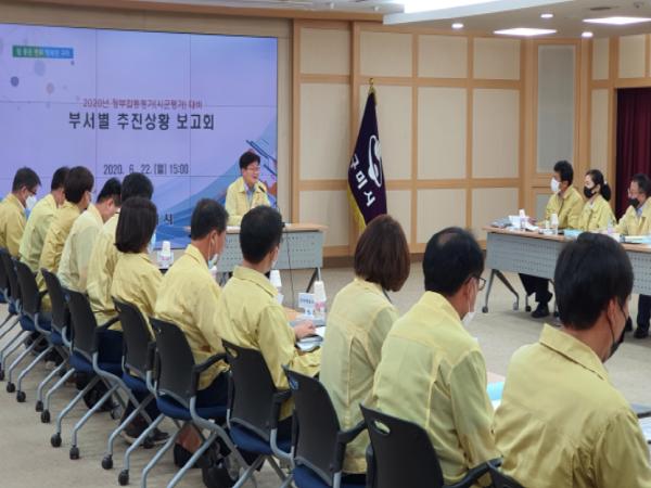 구미시(시장 장세용)는 6월 22일 오후 3시 시청 3층 상황실에서 2020년 정부합동평가(시군평가) 대비 부서별 추진상황 보고회를 개최했다.