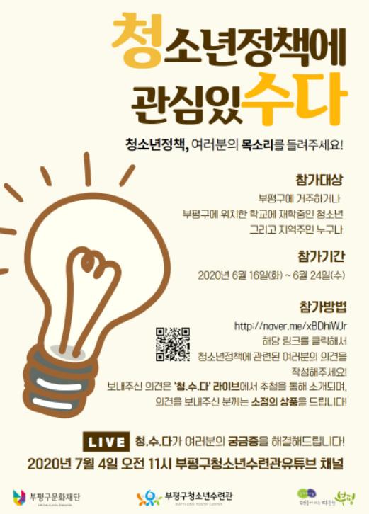 인천시 부평구(구청장 차준택)청소년수련관은 오는 7월 4일 청소년에게 더 나은 정책을 만들어가기 위한 청소년 정책 토크 ‘청:수다’ 라이브 방송을 수련관 유튜브 채널에서 진행한다.