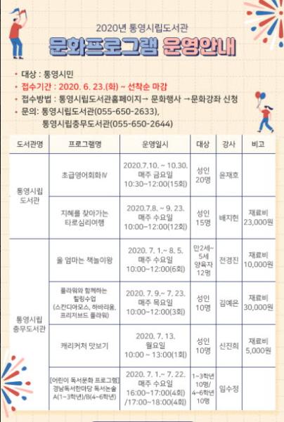 문화프로그램 관련 자세한 내용은 통영시립도서관 홈페이지를 참조하거나 통영시립도서관(☎055-650-2633) 또는 충무도서관(☎055-650-2644)으로 문의하면 된다.