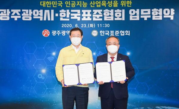 광주시는 23일 오전 시청 비즈니스룸에서 이용섭 시장과 이상진 한국표준협회장 등이 참석한 가운데 ‘대한민국 인공지능 산업 육성’을 위한 업무협약을 체결했다.
