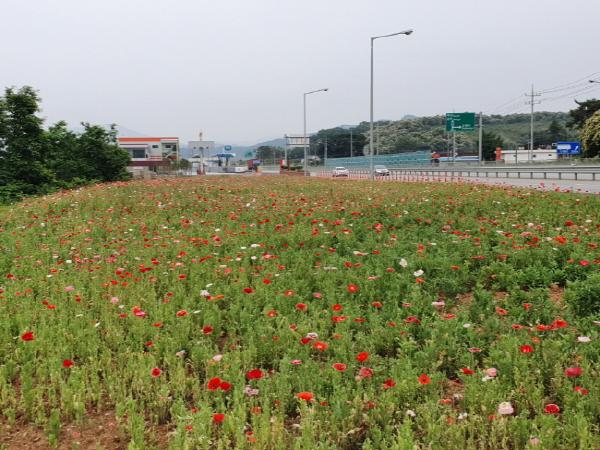 공주시 신풍면 산정리 대로변에 관상용 양귀비 꽃이 만개해 지나가는 사람들의 시선을 끌고 있다.