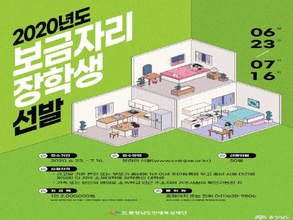 (재)충남인재육성재단(이사장 양승조, 이하 재단)은 도민 또는 도민 자녀인 대학생의 주거비 부담 해소를 위해 월세액을 지원하는 보금자리 장학생을 6월 23일부터 모집·선발한다.