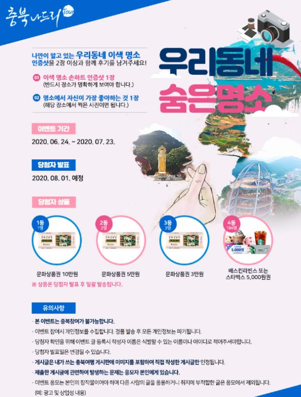 충청북도는 6월 24일부터 7월 23일까지 충북나드리를 통해 우리동네 숨은 명소 알리기 이벤트를 추진한다.