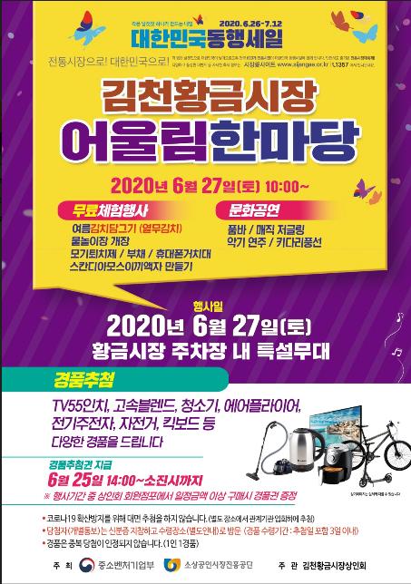이번 행사는 6월 26일부터 7월 12일 기간, 코로나19 위기 극복과 소비 진작을 위해 중소벤처기업부에서 주최하는 대한민국 동행세일 행사의 일환으로, 김천 황금시장은 2020년 상반기 선정된 시장경영바우처지원 국비 추경사업의 사업비를 활용하여 무료체험행사 및 문화공연, 경품행사 등 마케팅 행사를 준비하였다.