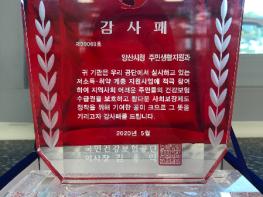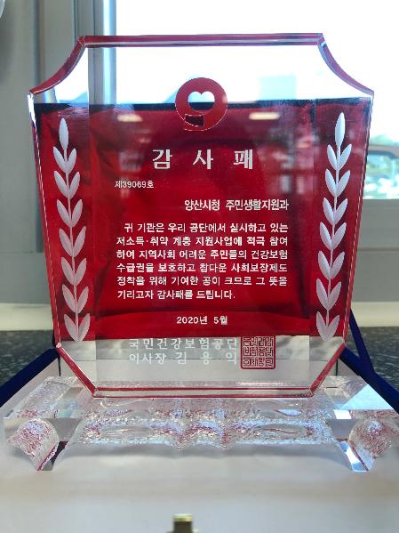 양산시 ‘주민생활지원과’가 지난 23일 국민건강보험공단(이사장 김용익)으로부터 저소득·취약계층 대상 국민건강보험료 지원사업의 적극 추진 및 참다운 사회보장제도의 정착에 기여한 공을 인정받아 감사패를 받았다.
