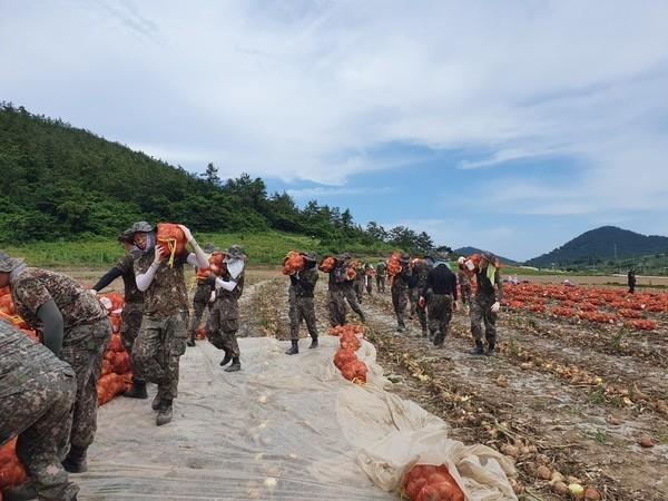 이날 일손 돕기는 읍면 직원 180명과 31사단 김호규 대대 장병 20여명 등 200여명이 참여하여 3ha면적의 양파 수확을 지원하였다.