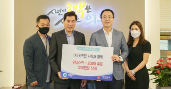 의왕시(시장 김상돈)는 23일 사단법인‘위드인 사람과 함께(후원회장 정기열)’에서 코로나19 극복을 위한 200만원 상당의 면 마스크 1,200매를 전달 받았다고 밝혔다.