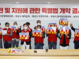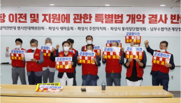 전투비행장 화성이전반대 범시민대책위원회(이하 범대위)·화성시 주민자치회·통리장단협의회·새마을회·남부수협어촌계협의회 등 화성시 시민단체들은 6월 24일 11시 모두누림센터 세미나실에서 ‘군공항 이전 및 지원에 관한 특별법 개정안(이하 개정안)’철회를 촉구하는 성명서를 발표했다.