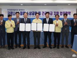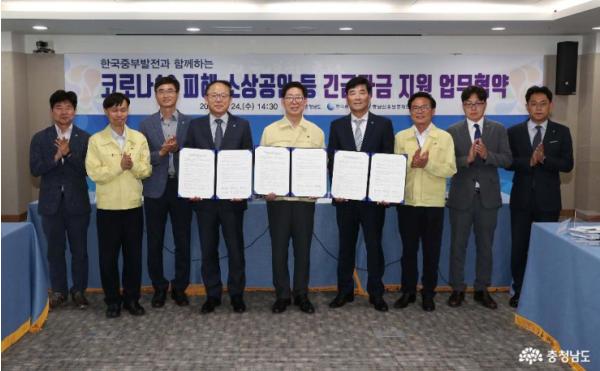 양승조 충남지사는 24일 도청에서 박형구 한국중부발전 사장, 유성준 충남신용보증재단 이사장과 ‘소상공인 금융지원 업무협약’을 체결했다.