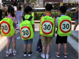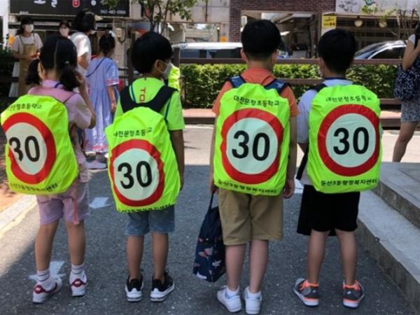 책가방 덮개는 방수기능 소재에 ‘속도제한 30’을 인쇄하였고 형광색으로 주.야간에도 시인성이 좋아 등하굣길 아이들의 안전을 한층 높여줄 전망이다.