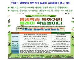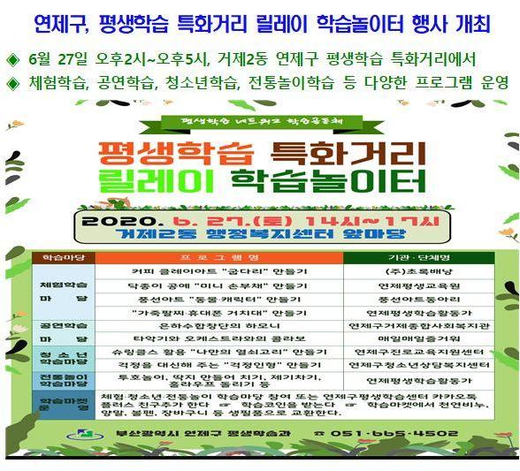 연제구(구청장 이성문)는 학습기관·단체 네트워킹을 통해 다양한 평생학습 프로그램을 개발하고 주민 주도 학습마을 커뮤니티 조성을 위해 연제구 평생학습 특화거리 릴레이 학습 놀이터를 6월 27일 오후 2시부터 오후 5시까지 평생학습 특화거리(거제2동 행정복지센터 앞 거리)에서 행사를 개최한다.