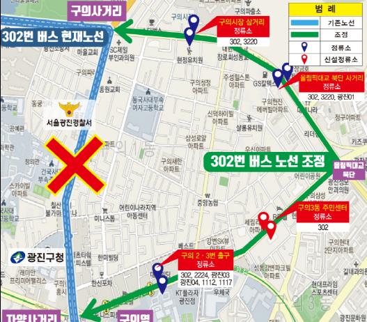 노선 조정에 따라 302번 버스는 광진구 구간에 위치한 정류소 중 ‘광진구청’, ‘광진경찰서’ 정류소를 경유하지 않고, ‘구의역2·3번출구’, ‘구의3동주민센터’, ‘올림픽대교북단사거리’, ‘구의시장삼거리’ 정류소를 경유하게 된다.