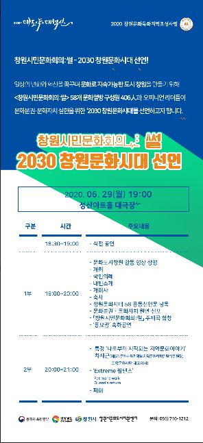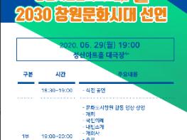 창원시(시장 허성무)와 창원시문화도시지원센터는 오는 29일 저녁 7시 성산아트홀 대극장에서 「2030창원문화시대」 선포식을 개최한다고 밝혔다.