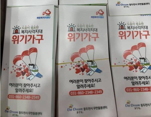 동두천시 무한돌봄센터는 지난 24일 복지위기가구 발굴 및 센터 홍보에 활용하기 위한 리플릿을 제작했다. 총 6면으로 구성된 홍보 리플릿은 동두천시 무한돌봄센터와 위기가구 발굴, 통합사례관리 사업 등을 시민들의 눈높이에서 설명하는데, 초점을 맞추어 제작되었다.