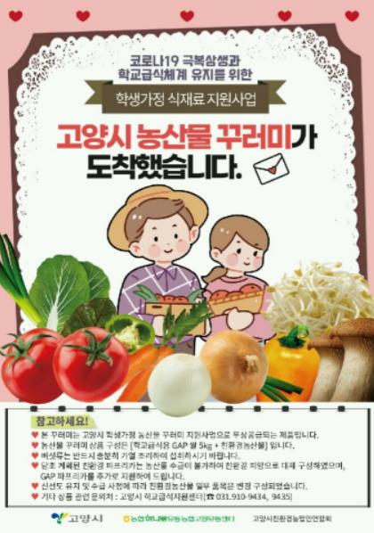 송세영 농업기술센터소장은 “고양시 농산물 꾸러미가 학부모들의 경제적 부담을 덜고, 그간 어려움을 겪고 있던 학교급식 계약재배 농가들에게 도움이 될 것으로 기대한다”라고 밝혔다.