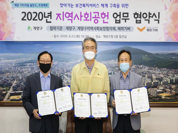 인천 계양구(구청장 박형우), 계양구지역사회보장협의체(민간위원장 최종호)와 사단법인 해피기버(이사장 권태일)는 23일 계양구청 3층 접견실에서 찾아가는 보건복지서비스 체계 구축을 위한 ‘지역사회공헌’ 업무협약을 체결했다.