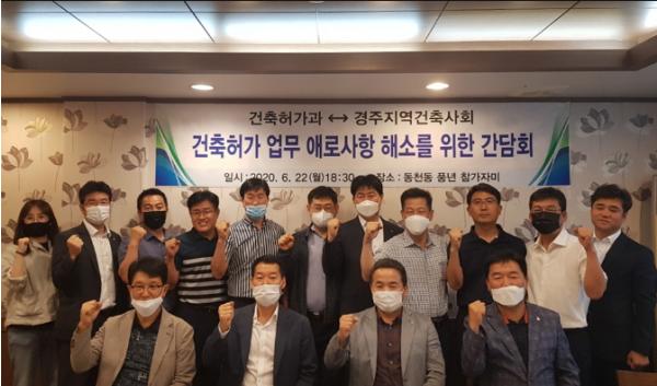 이날 간담회는 이상원 건축허가과장, 최규식 경주지역건축사회장, 지역의 건축사 및 관계 공무원 등 20여명이 참석해 민원업무 처리 과정의 애로사항, 신속한 인·허가 업무처리를 위한 개선 및 발전방향, 조직개편에 따른 건축 관계자 의견 수렴 등 변화된 인·허가 환경에 대한 건축 관계자의 다양한 의견을 나눴다.