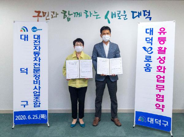 대전 대덕구(구청장 박정현)가 25일 구청 구민의 사랑방에서 대전자동차전문정비사업조합(이사장 김동수)과 지역화폐 대덕e로움 유통활성화를 위한 업무협약을 맺었다.