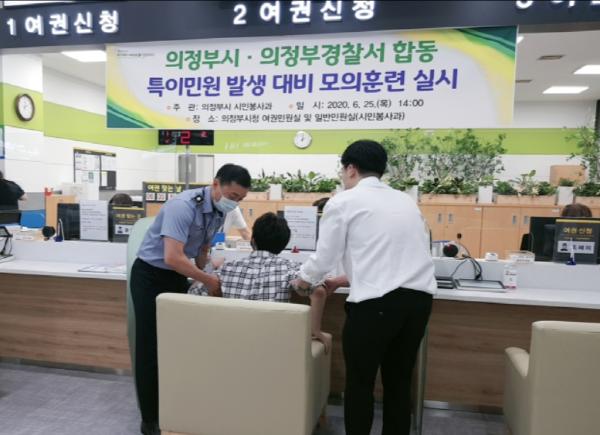 의정부시(시장 안병용)는 6월 25일 의정부경찰서와 합동으로 시청 민원실에서 발생 가능한 폭언·폭행 등 특이민원 발생을 대비하기 위한 모의훈련을 실시했다.