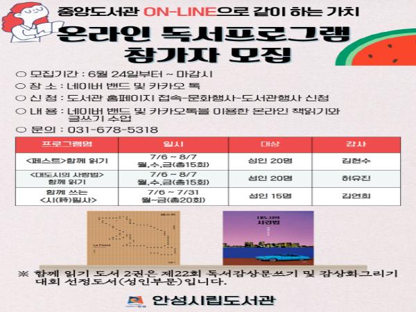 7월 6일부터 8월 7일까지 온라인 네이버 밴드 및 카카오톡에서 독서토론 전문강사를 통해「<페스트>함께 읽기」,「<대도시의 사랑법>함께 읽기」,「함께 쓰는<시(詩)필사」를 주제로 온라인 독서 및 글쓰기 프로그램이 진행되며, 시민들은 자신이 관심 있는 주제를 선택해서 참여할 수 있다.