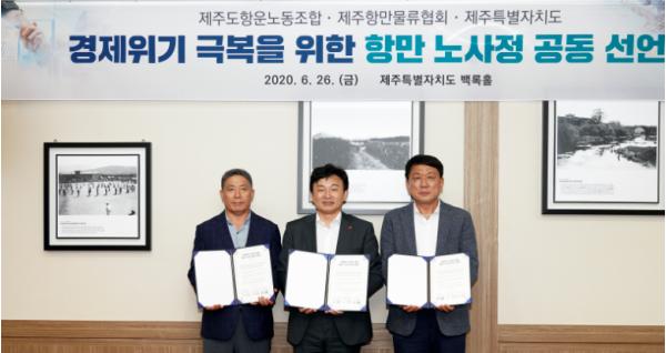 제주특별자치도는 26일 오후 4시 40분 제주도청 백록홀에서 ‘경제위기 극복을 위한 항만 노·사·정 공동 선언식’을 개최했다고 밝혔다.