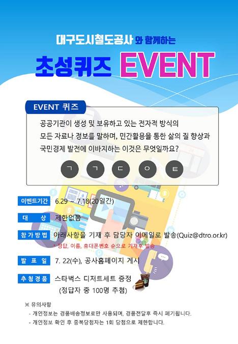 대구도시철도공사(사장 홍승활)는 공공데이터 인지도 향상 및 이용 촉진을 위한 ‘공공데이터 퀴즈이벤트’를 개최한다고 밝혔다.