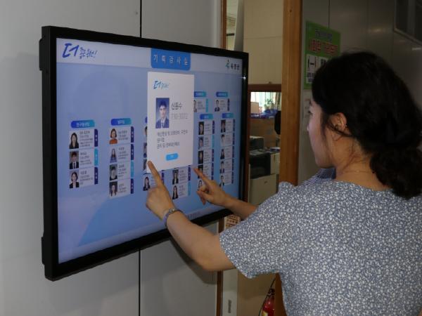 전자 좌석배치도는 기존 직원안내판을 LED 모니터(대형 터치 모니터 16대)로 교체 설치하여 각 부서를 방문하는 민원인이 직원정보, 담당업무, 재실현황 등 최신 직원정보를 실시간으로 확인할 수 있도록 좌석배치도를 디지털화해 제공하는 시스템이다.