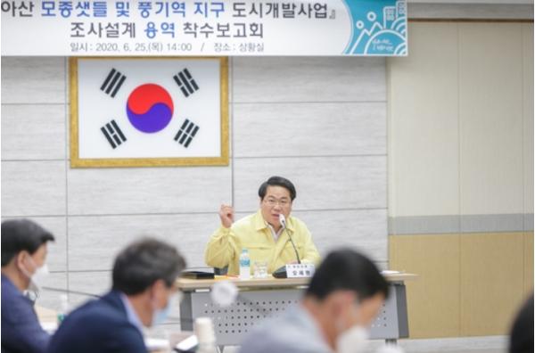 아산시(시장 오세현)는 25일 시청 상황실에서 오세현 아산시장을 비롯한 자문위원 등이 참가한 가운데 ‘아산 모종샛들지구 및 풍기역지구 도시개발사업’을 위한 용역 착수보고회를 개최했다.
