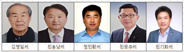 시는 부문별로 △문화?예술?언론 김명일 삼화대장간 야장 △교육?체육 진용남 대한조정협회수석부회장 △산업?경제 정민환 한국노총충주음성지역지부의장 △농림·축산 진광주 중원농업협동조합장 △사회봉사윤리 진기화 새마을지도자충주시협의회장 등 5인을 선정했다.
