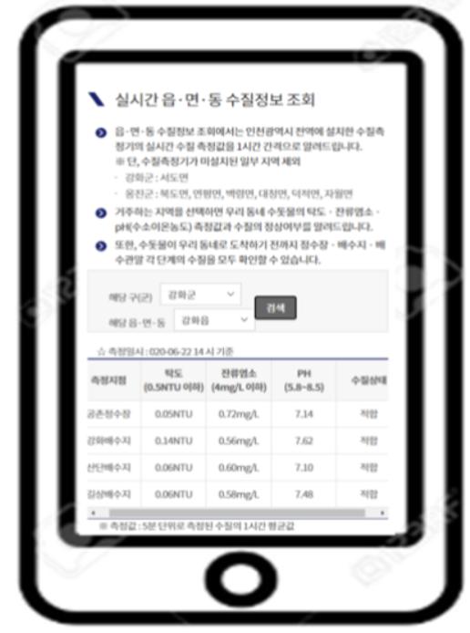 현재 공개하는 수질정보는 4개 정수장(부평, 남동, 공촌, 수산)에서 생산하는 수돗물에 대한 수질정보를 2017년 2월 7일부터 시 홈페이지를 통해 공개 서비스하고 있으며, 오는 6월 30일부터는 정수한 깨끗한 물을 보관하고 있는 31개 배수지까지 수질정보를 확대 공개하여, 해당지역의 읍·면·동별로 정수장에서 배수지까지 수질정보를 조회할 수 있다.