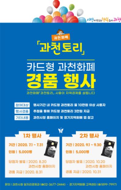 과천시는 1회당 5천명씩 총 1만명을 추첨하여 경품으로 카드형 ‘과천토리’ 3만원을 지급할 예정이다. 당첨자는 8월 20일과 10월 20일에 과천시 홈페이지(www.gccity.go.kr)을 통해 발표된다.