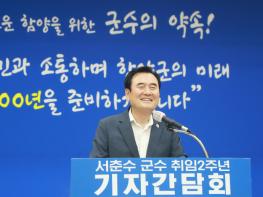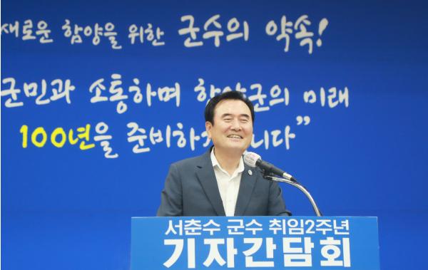 서춘수 함양군수가 29일 군청 대회의실에서 민선7기 2주년 기자간담회를 갖고, 전반기 주요성과와 후반기 군정운영 방향 등을 밝혔다.