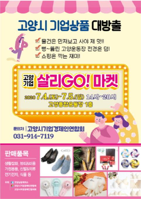 고양시(시장 이재준)는 코로나19로 인해 매출 부진을 겪고 있는 고양시 관내 기업을 위해 7월 4일(토) ~ 5일(일) 이틀간 고양종합운동장에서 '기업살리GO! 마켓'을 개최한다고 밝혔다.