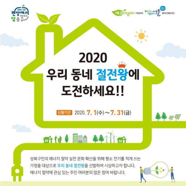 성북구(구청장 이승로)는 구민의 에너지 절약 우수사례를 발굴하여 보급하고 자발적인 에너지 절약 실천 문화를 확산하기 위하여 “2020 우리 동네 절전왕”을 선발한다고 밝혔다.