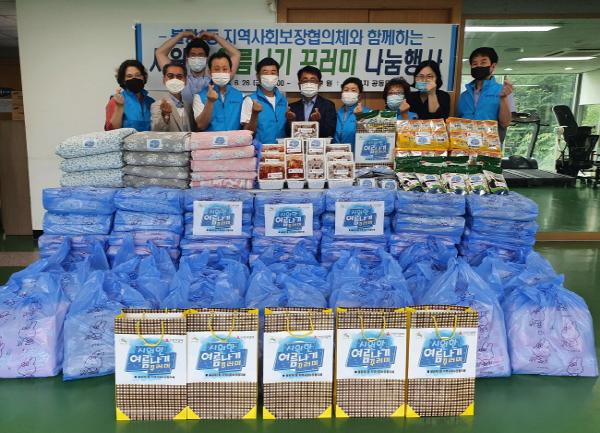 이번 행사는 연일 더위와 코로나19로 생활에 어려움을 겪고 있는 중장년1인가구, 독거어르신과 기초생활수급자 등 취약계층이 시원하고 건강한 여름을 보낼 수 있도록 꾸러미 100개를 만들었다. 꾸러미 물품으로 여름이불, 밑반찬(불고기, 배추김치), 부식세트(조미김, 돌자반)와 여름 면마스크를 준비하여 직접 찾아가 안부도 확인하고 나눔 꾸러미도 전달하였으며 코로나19 예방 홍보도 하였다.