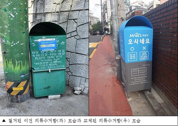 권역별 운영·관리자들은 정기적인 의류 수거 뿐 아니라 의류수거함 주변을 청결히 하는 의무 사항이 담긴 협약을 지난 4월 체결했다. 아울러 5월부터는 기존에 일정 규격 없이 설치된 수거함을 자진 철거하도록 하는 한편 마포구 휘장색을 활용한 산뜻하고 청결한 디자인의 의류수거함을 제작·설치함으로써 밝고 활기찬 도심 분위기를 조성하도록 했다.
