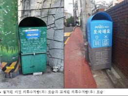 한편 구는 관리가 되지 않는 소유자 미상 의류수거함에 대한 강제철거 절차에 돌입하며 도시 미관 향상에 박차를 가한다. 철거 작업을 통해 도시 흉물로 방치되어 있던 24개의 의류수거함이 제거되면 더욱 청결한 마포 골목 분위기가 조성될 것으로 기대된다.