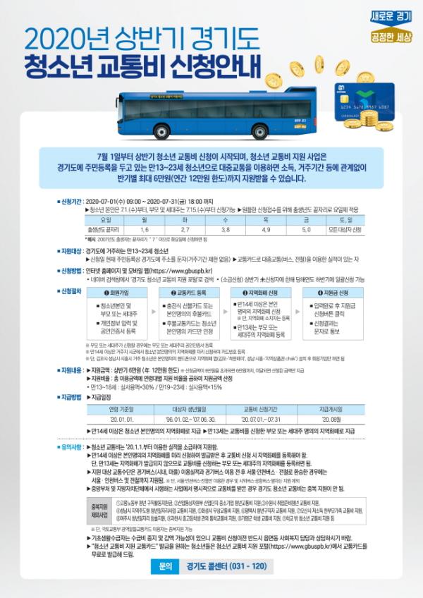 경기도는 ‘2020년도 상반기 청소년 교통비 지원사업’의 신청접수를 오는 7월 1일부터 시행한다고 밝혔다.