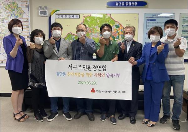 인천 서구 오류동 소재 ‘서구주민환경연합(회장 황우근)’은 지난 29일 검단동 행정복지센터(동장 손진승)를 방문해 관내 어려운 이웃을 위해 써 달라며 10kg 양곡 30포를 기탁했다.